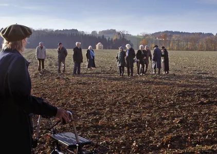 ANGELA SUMMEREDER: Sie sind auf alle Fälle Außenseiter. Es geht mir im filmischen Erzählen auch immer wieder darum, Geschichten von den Rändern her zu erzählen. Im zeitlichen, räumlichen und soziologischen Sinn. Ein Sinnbild dafür ist in diesem Film das des Ausgrabens. Daher steht es auch ganz prominent zu Beginn des Films als ein Bild des Pflügens. In einem weiteren Aspekt nimmt diese Ackersequenz etwas vorweg, was im Verlauf des Films eine wichtige Rolle spielen wird. Die Spannung zwischen Erde und Himmel. Das kommt als Denkansatz von Schappeller zur Sprache und das hat auch mit der Wirklichkeitserfahrung damaliger Bauern zu tun. Die Erde, die Härte der Existenz in Verbindung mit Armut und harter Arbeit. Gleichzeitig sind da diese hochfliegenden Ideen, Visionen und Träume. All das prallt aufeinander und kulminiert in einer Figur wie Schappeller.