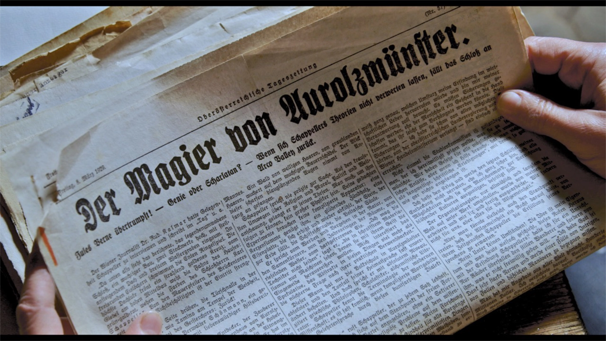 ANGELA SUMMEREDER: Über die Sprache. Ich hab mich im Archiv durch sehr vieI Briefe, unterschiedliche Korrespondenzen gelesen. Bekam dabei allmählich ein Gefühl dafür, wie diese Menschen denken und ticken. Interessant fand ich dabei z.B. die Erwähnung Schappellers, er hätte alles, was er weiß, seiner Frau „abgelernt“. Bezeichnenderweise findet sich im Archiv aber kein einziger Strich von der Frau selbst. Kein Brief, kein Zettel, nichts. Die Herausforderung der Recherche war folgende: Einerseits der Figur nahe zu kommen, mich einzulassen auf Denk- und Sichtweisen dieser Zeit, ohne Besserwisserei der später Geborenen und gleichzeitig zu vermeiden, ihnen „auf den Leim zu gehen“. Einfühlung unter Wahrung kritischer Distanz. Ich habe versucht, auch die Geschichte meiner Recherche einfließen zu lassen. Die verschiedenen Schichten sollten transparent bleiben: zunächst war da der kollektive Mythos, das, worüber die Leute heute noch im Ort reden. Im Linzer Landesarchiv gibt es eine ungeheure Menge an Zeitungsdokumenten, sie bestätigen allerdings in erster Linie den Mythos und schmücken das Drumherum sehr aus. Gefehlt haben mir im Dokumentfundus Unterlagen, die seine Hypothese, seine Theorien genauer ausführen. Ein glücklicher Zufall hat mich mit Peter Schlosser in Wien in Verbindung gebracht, der einen ausführlichen, englischsprachigen Bericht über Schappellers physikalischen Ansatz übersetzt und sich sehr intensiv damit auseinander gesetzt hat. Als weiteren Glücksfall sehe ich den Fund von Filmmaterial, das die Schappellers selbst gedreht hatten. Das war damals eine Sensation. Heimkino aus den 1920er Jahren, gedreht auf 9,5 mm Format von Pathé mit Perforation in der Mitte des Filmstreifens. Die Schappellers haben sehr viel gedreht. Nach dem Tod der Familie stapelten sich im heruntergekommenen Schloss die Filmdosen bis unter die Decke. Irgendwann kam ein Eisenhändler vorbei, nahm die Dosen als wieder verwendbares Alteisen mit und warf die Filme weg. Ein Bruchteil davon ist erhalten, ich konnte über Umwege, über einen privaten Sammler, einem Schweizer, an die letzten Reste dieses Materials kommen. Dieses Material aus den 1920/1930-er Jahren hat einen großartigen Ansatz für den Film geschaffen. Mir war schnell klar, dass diese Geschichte über ein rein dokumentarisches Verfahren nicht erzählbar ist.